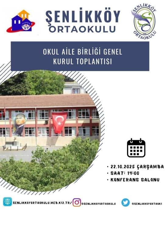 Okul Aile Birliği genel kurul toplantısı 22 Ekim 2025 Çarşamba günü Saat 14:00'da tekrarlanması durumunda ise 30 Ekim 2025 tarihinde okulumuz konferans salonunda yapılacaktır. Tüm velilerimize duyurulur.